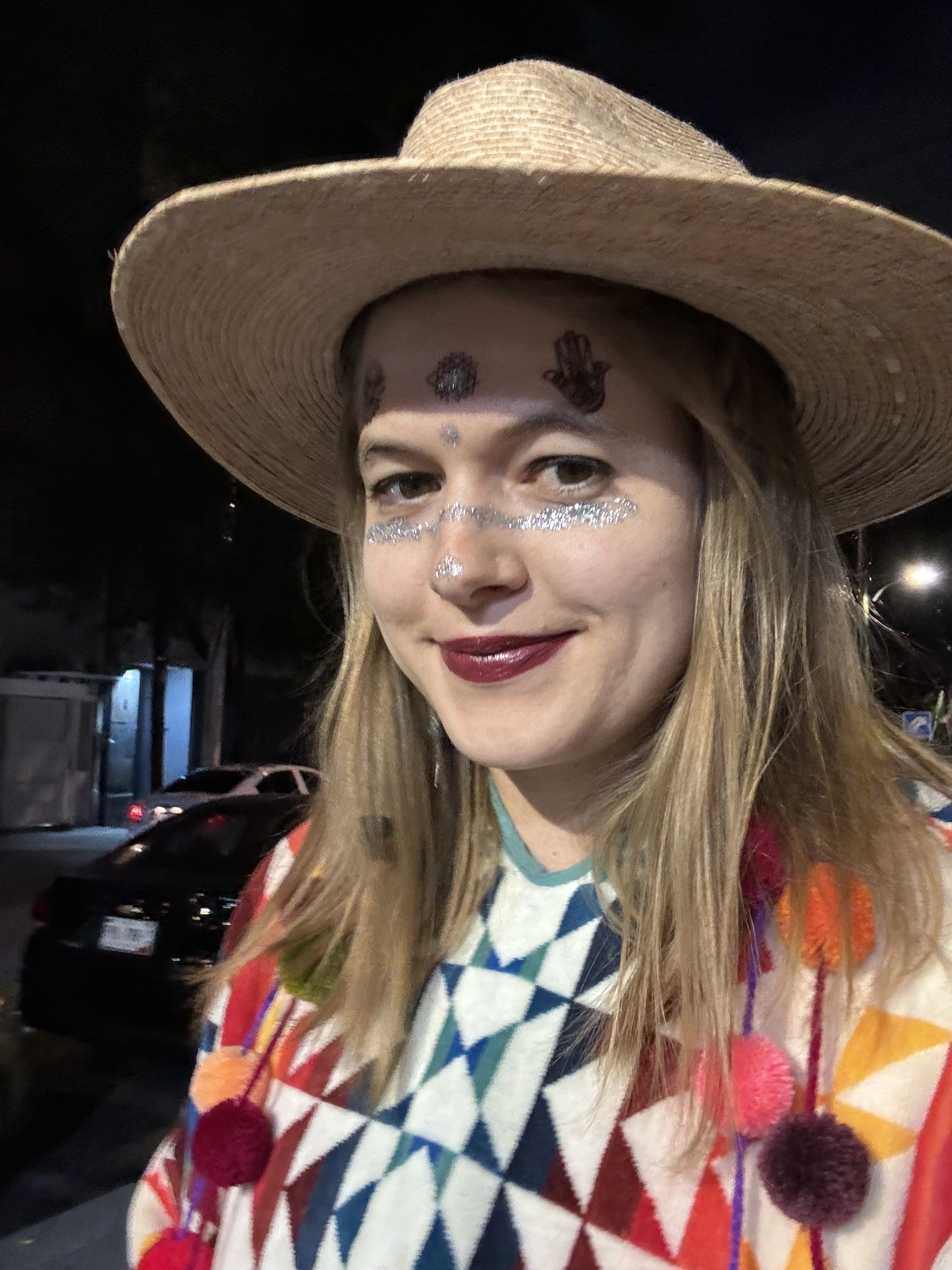 I dressed up as the Tuluminati last year for Halloween. Notice my appropriation of colorful pom-pom strings from Puebla, my wide-brimmed hat, my "spiritual" tattoos on my arms, sparkly face tattoos, and the incongruous mix of brands, including a Free People tank top, Lululemon leggings, and Birkenstocks. Plus, reflective sunglasses inside, of course!